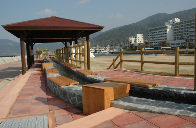 小浜温泉的源泉温度为105度,乃日本国内最高温度,与之相呼应,这里营造了105米长的100%源泉免费足汤,乃日本最长的泡脚处。