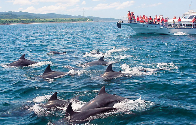可从船上观摩栖息于岛原半岛近海的野生海豚。与海豚相遇的概率高达90%,近距离观摩海豚可爱的身姿,感动的瞬间,令人难以忘怀。船舶从口之津港、加津佐港出发。船程1小时~1小时20分钟