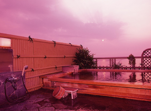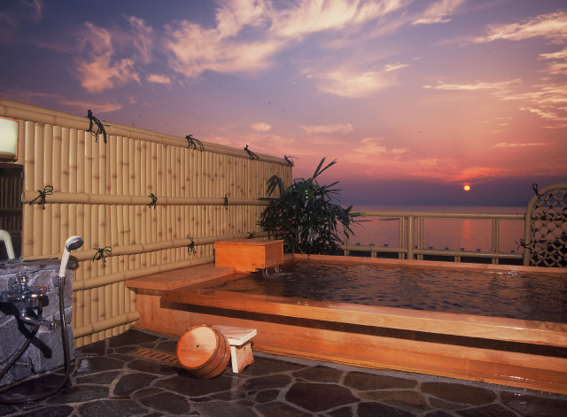 타치바나만 너머로 지는 석양을 바라보며 온천을 즐길 수 있는 히노키의 전망 노천탕 “이리히(석양) 탕”.