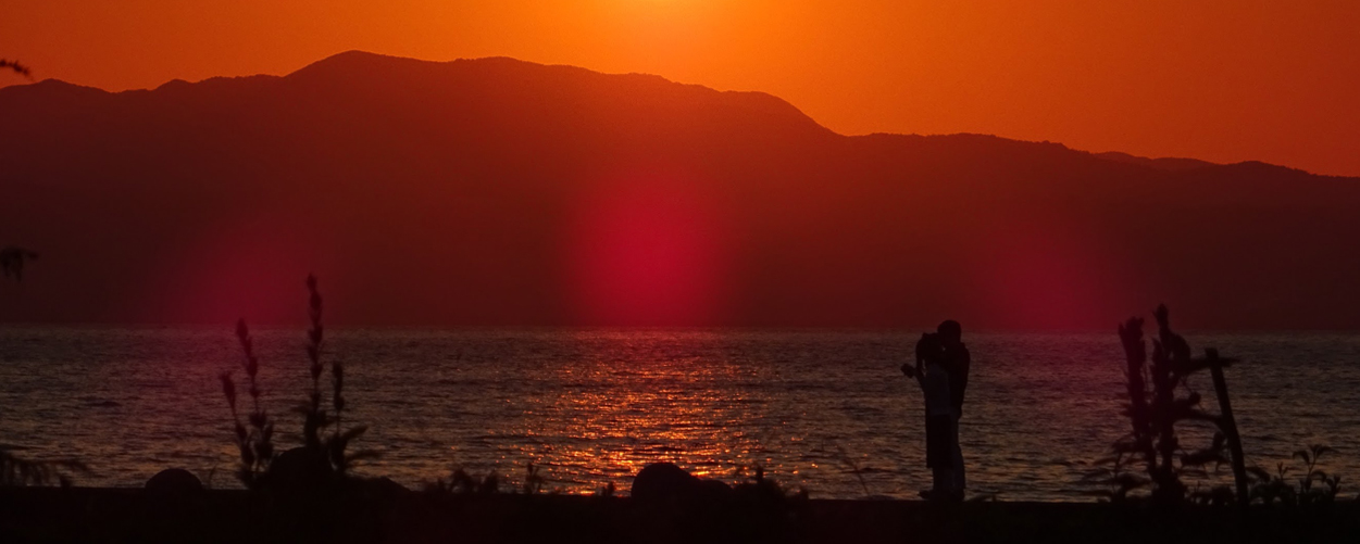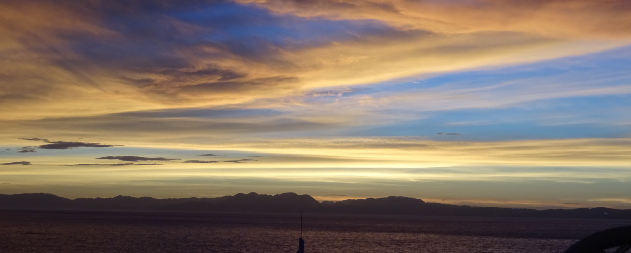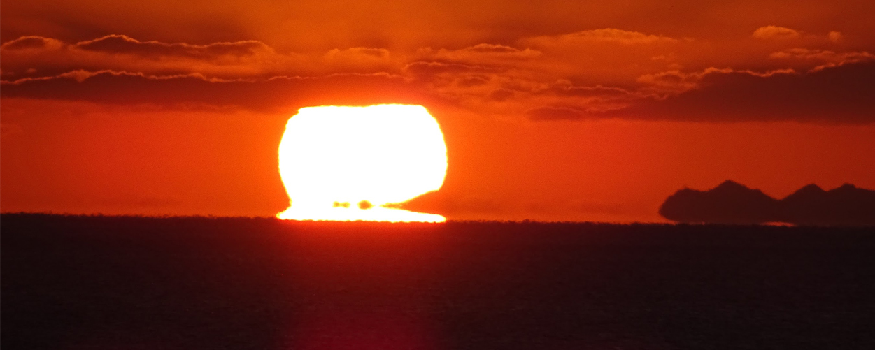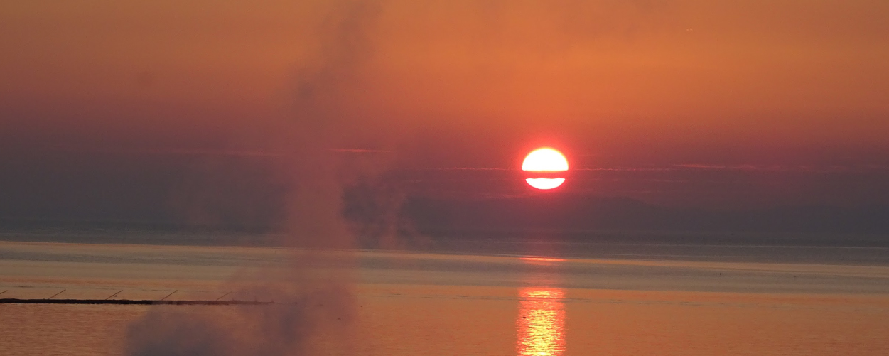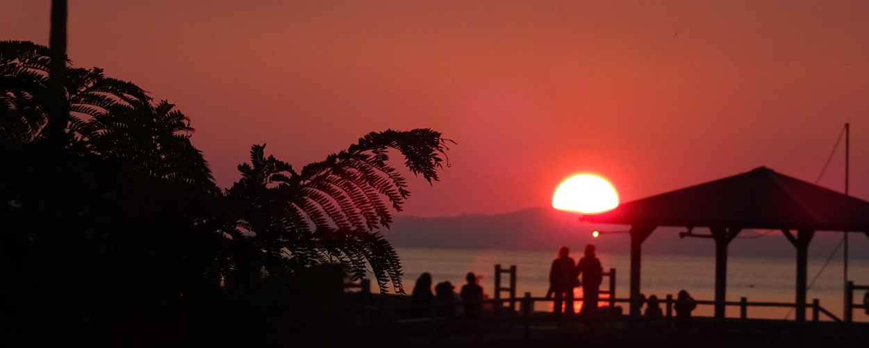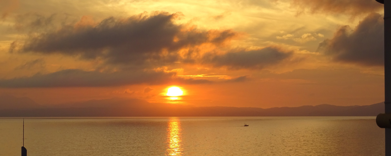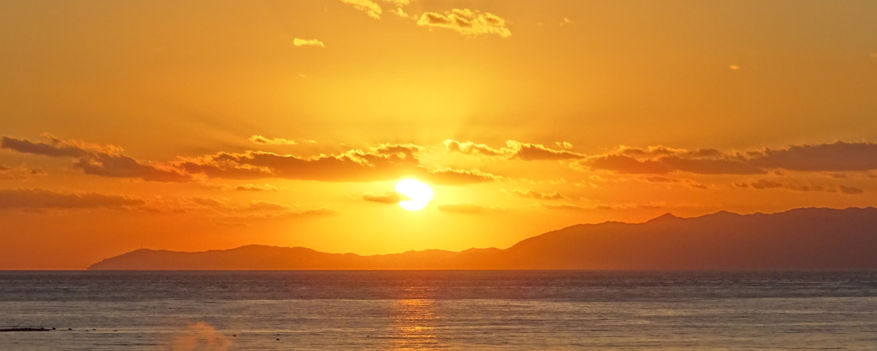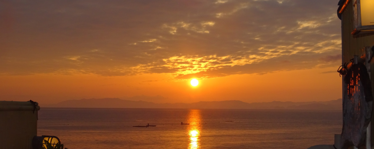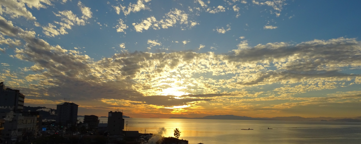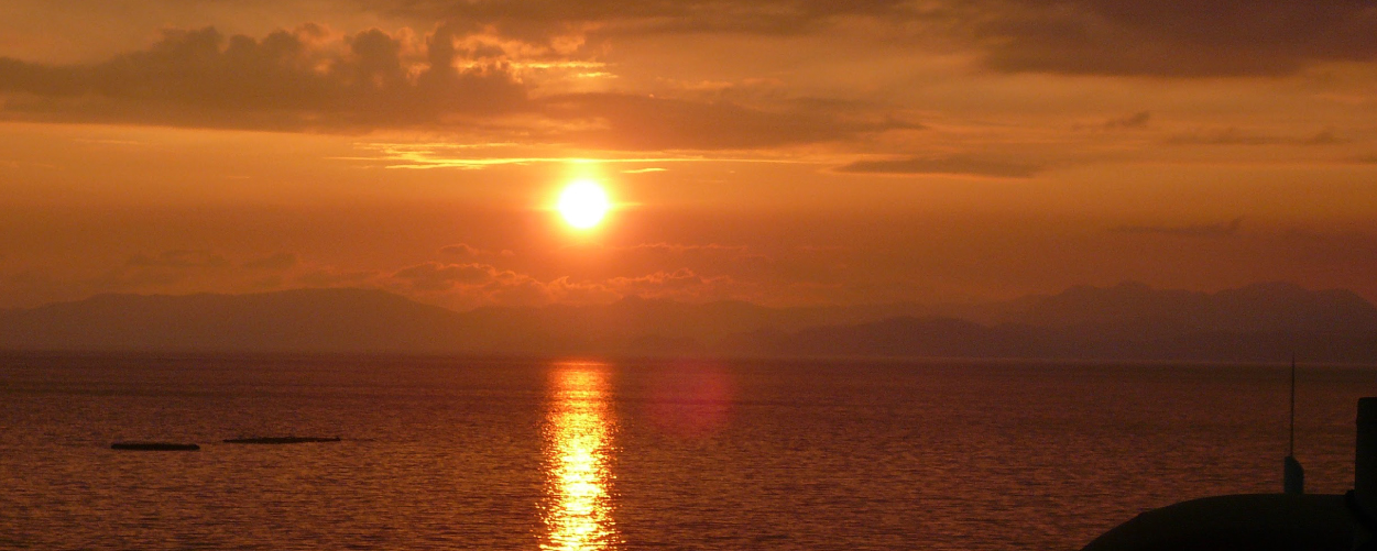 시시각각 색채를 바꿔가며 타치바나만 수평선 너머로 지는 아름다운 석양.